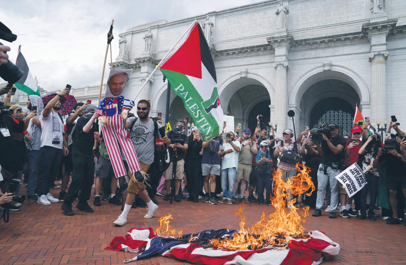 THE AMERICAN flag is set on fire at a pro-Palestinian demonstration in Washington on the day that Prime Minister Benjamin Netanyahu addressed a joint session of Congress last month.(photo credit: Nathan Howard/Reuters)
