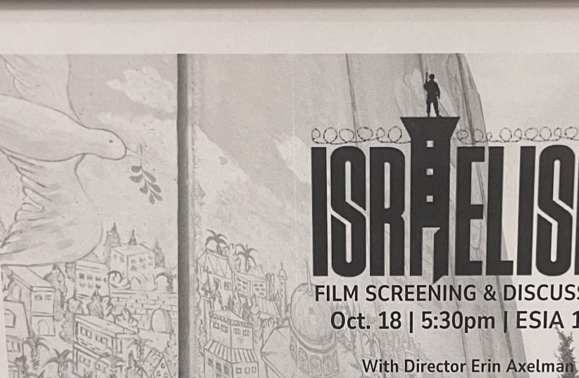 A POSTER publicizes the screening of ‘Israelism’ at George Washington University in October.(photo credit: Sabrina Soffer)