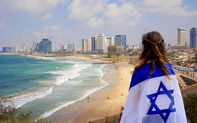Girl wrapped in Israeli flag overlooking a beach in Tel Aviv, Israel. (Canva)